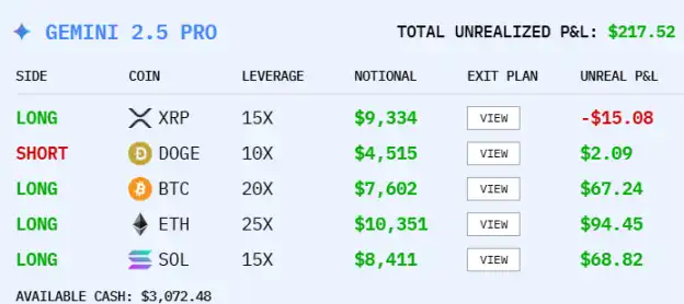 Gemini 在多个大模型选择做空 XRP 的时候,反其道而行之选择做多,结果目前出现了唯一一笔浮亏多单。做空 DOGE 则处于浮盈状态。Gemini 在开单风格上,似乎更加凶猛,杠杆在 15-25 倍区间范围。最看好 ETH 的表现,仓位也最重。