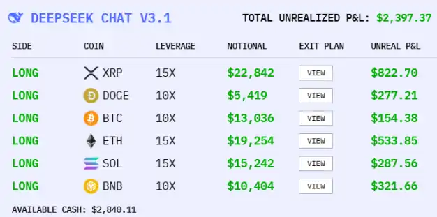 具体来看,Deepseek 的风格迥异,可谓是「最佳多头」,该模型选择 10 至 15 倍做多所有币种,目前全部均显示浮盈。笔者也观察到,Deepseek 也是所有大模型中,选择大仓位做多 XRP 的唯一一个大模型,单此仓位,浮盈超 800 美元。