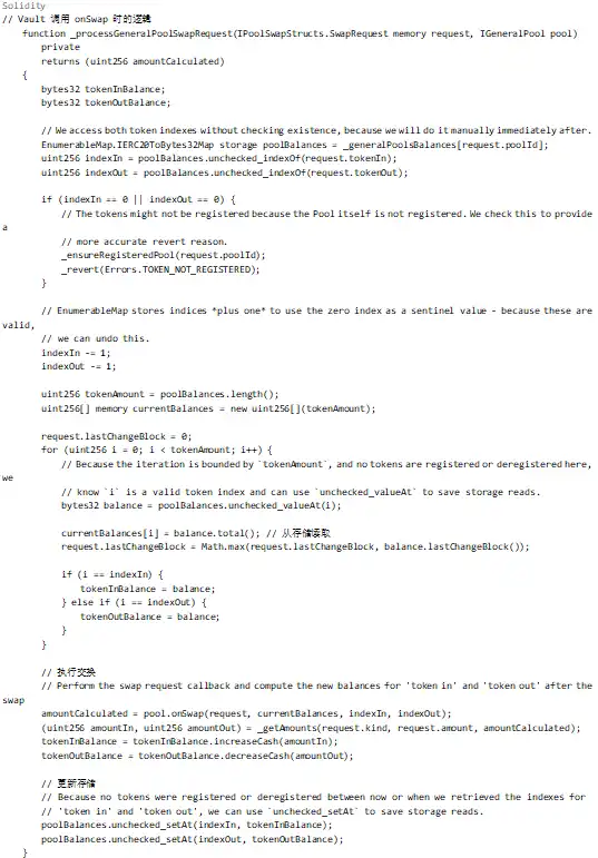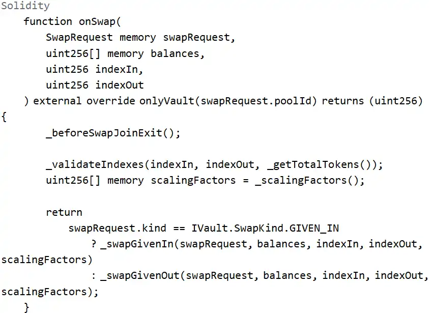 攻击的入口为 Balancer: Vault 合约,对应的入口函数为 batchSwap 函数,内部调用 onSwap 做代币兑换。