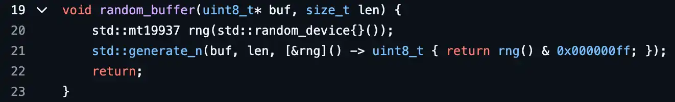 2023 年 4 月,安全研究者发现 Trust Wallet 浏览器扩展版(版本 0.0.172–0.0.182)在生成钱包助记词时使用了非密码学安全的随机函数 [4],其底层同样依赖 Mersenne Twister(MT19937)伪随机数算法(如下图所示),随机空间仅约 2^32 种可能性,远远不足以抵御穷举攻击。