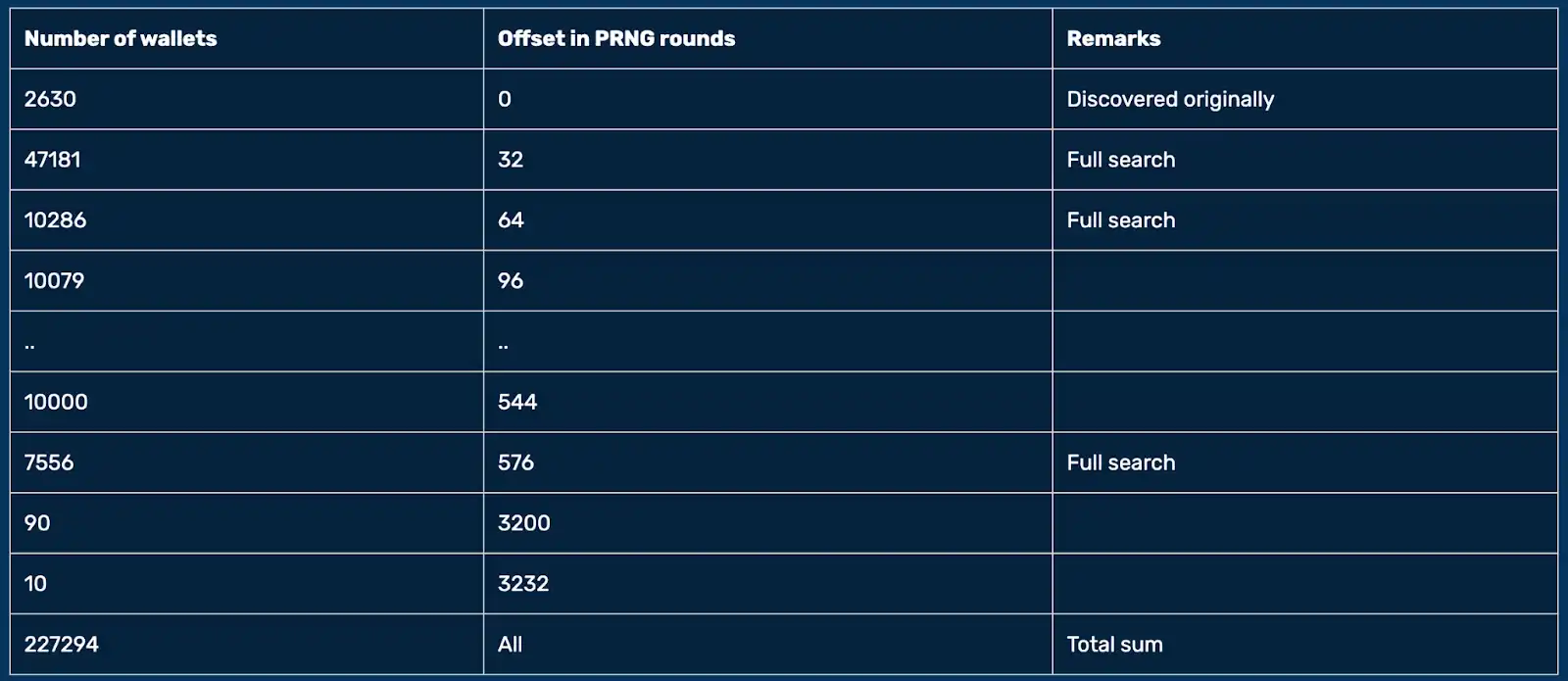 2025 年,在一位匿名白帽研究员提供的关键线索帮助下,长期停滞的分析工作取得了突破。MilkSad 团队发现受影响的软件在生成私钥时引入了一个新参数——PRNG 偏移量(offset),这一发现使研究者得以重新关联此前分散的钱包群体,揭示出背后统一的随机数生成模式。这一发现成为理解整个「弱钱包」事件成因的关键所在 [8]。