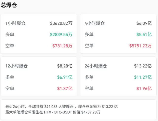 据 coinglass 统计,过去 24 小时全网有 34.2 万人被爆仓,爆仓金额超过 13 亿美元,其中多头头寸占损失的 85%。