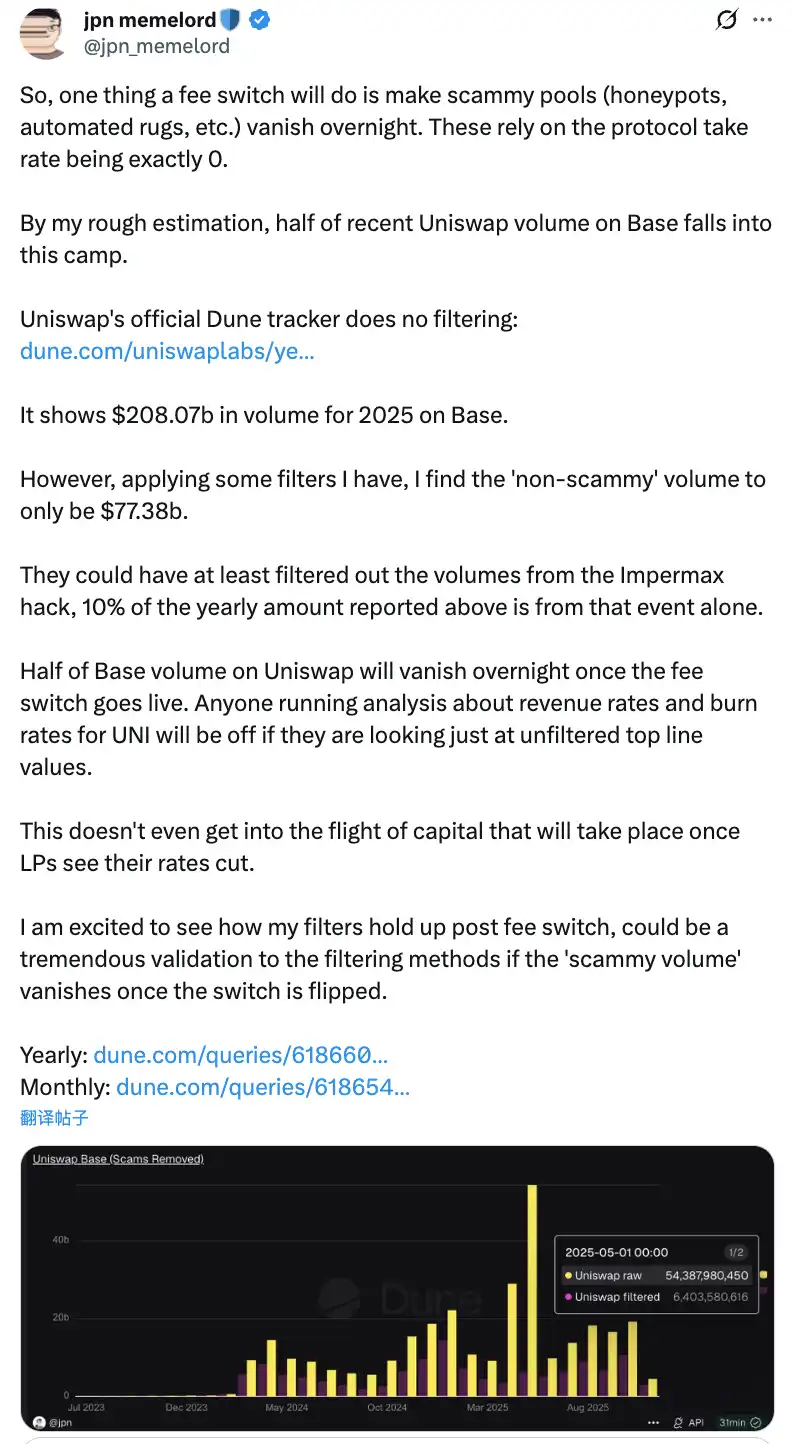 社区讨论一旦「费用开关」生效,将导致 Uniswap 在 Base 链上一半的交易量在一夜之间消失