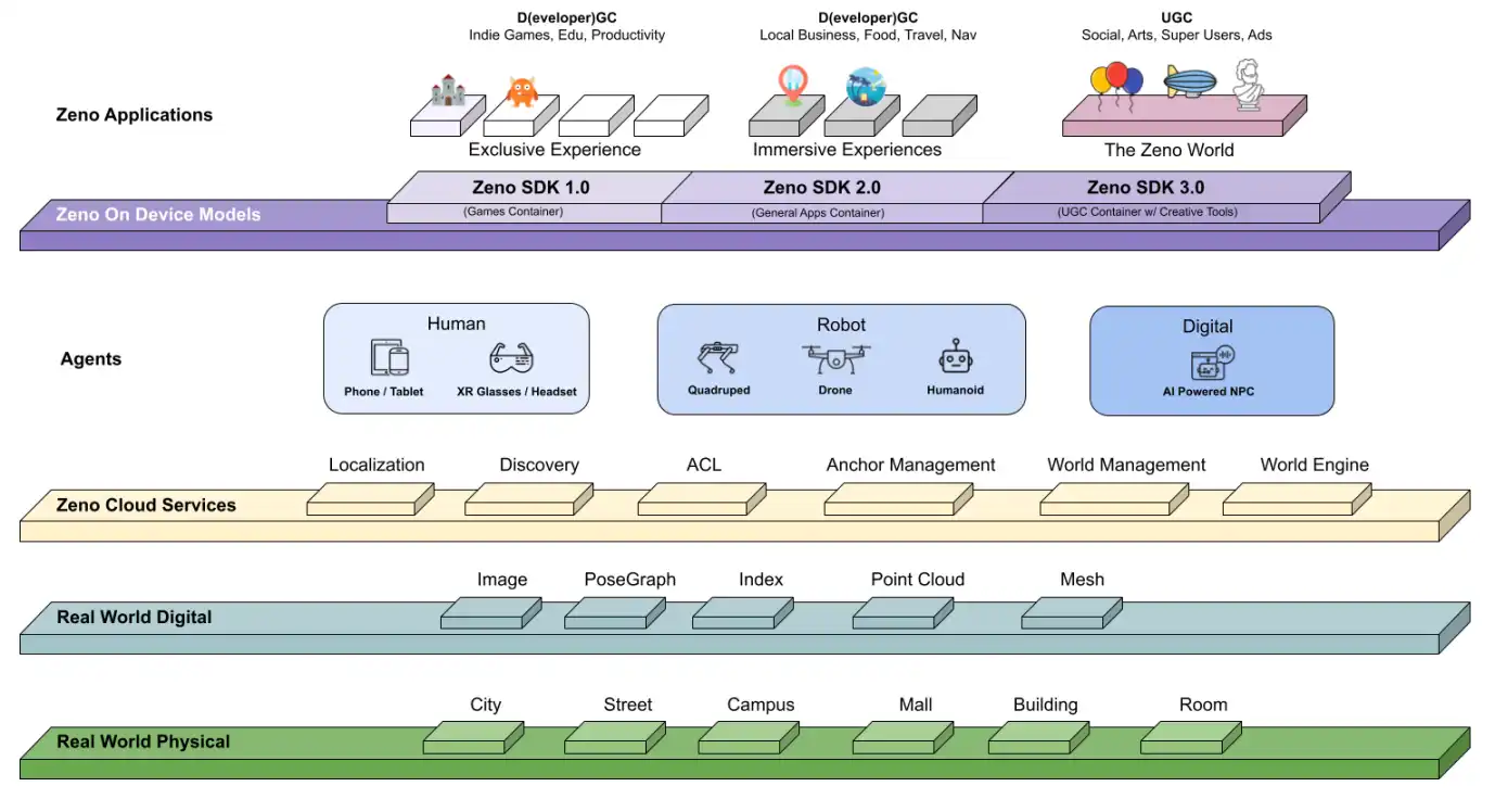 一言以蔽之,Zeno 想要在人类生活的物理空间中叠加面向 AI 和机器人等智能体的多层虚拟空间,使得包括人类在内的所有「智能体」能生活在同一空间里。
