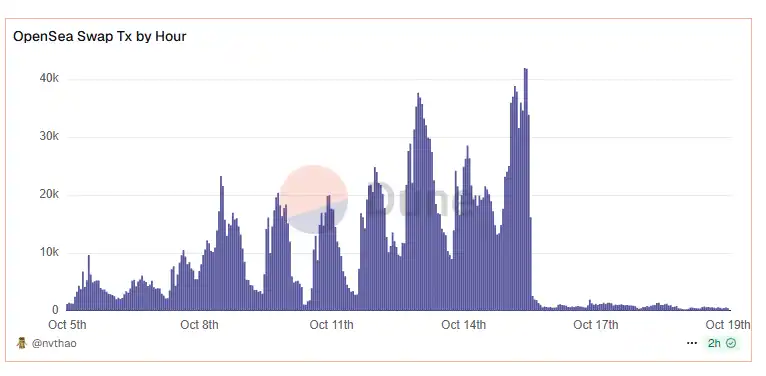 从数据来看,用户对「刷宝箱」活动的热情明显下降,许多人已经选择放弃参与 Wave 2 奖励活动。链上数据显示,自 Wave 1 奖励发放结束后,OpenSea 平台的 Swap 交易量出现断崖式下跌,表明市场活跃度明显减弱。