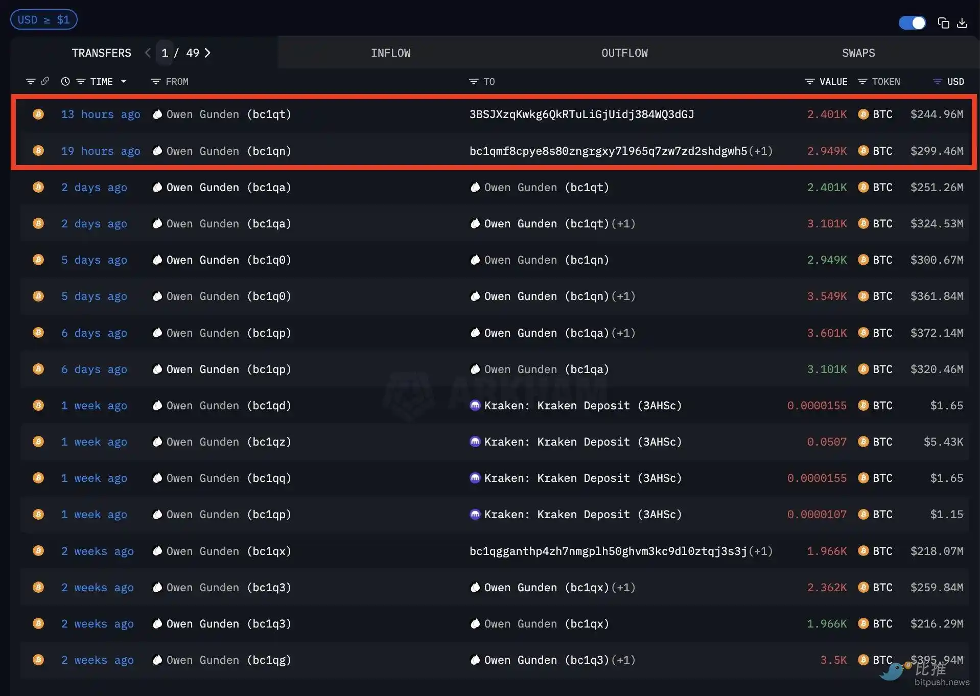 · 早期 BTC 巨鲸 Owen Gunden 单日出售约 2.9 亿美元 BTC,仍持有 2.5 亿美元资产;