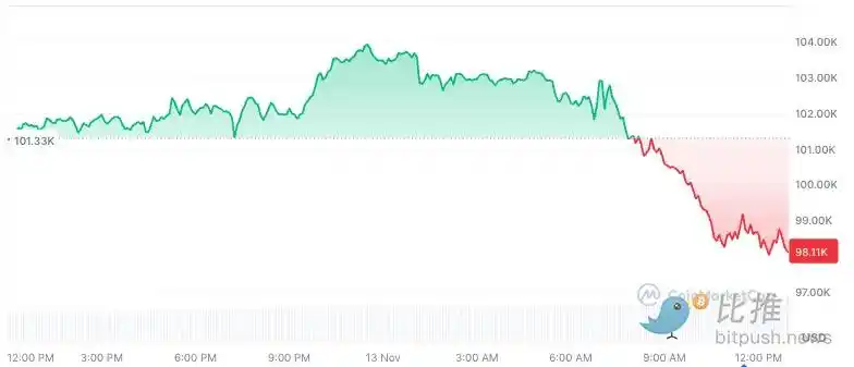 比特币在亚洲盘一度反弹至 10.4 万美元附近,但进入美国交易时段后迅速走弱,午后被快速砸穿 10 万美元,最低触及 98,000 美元。