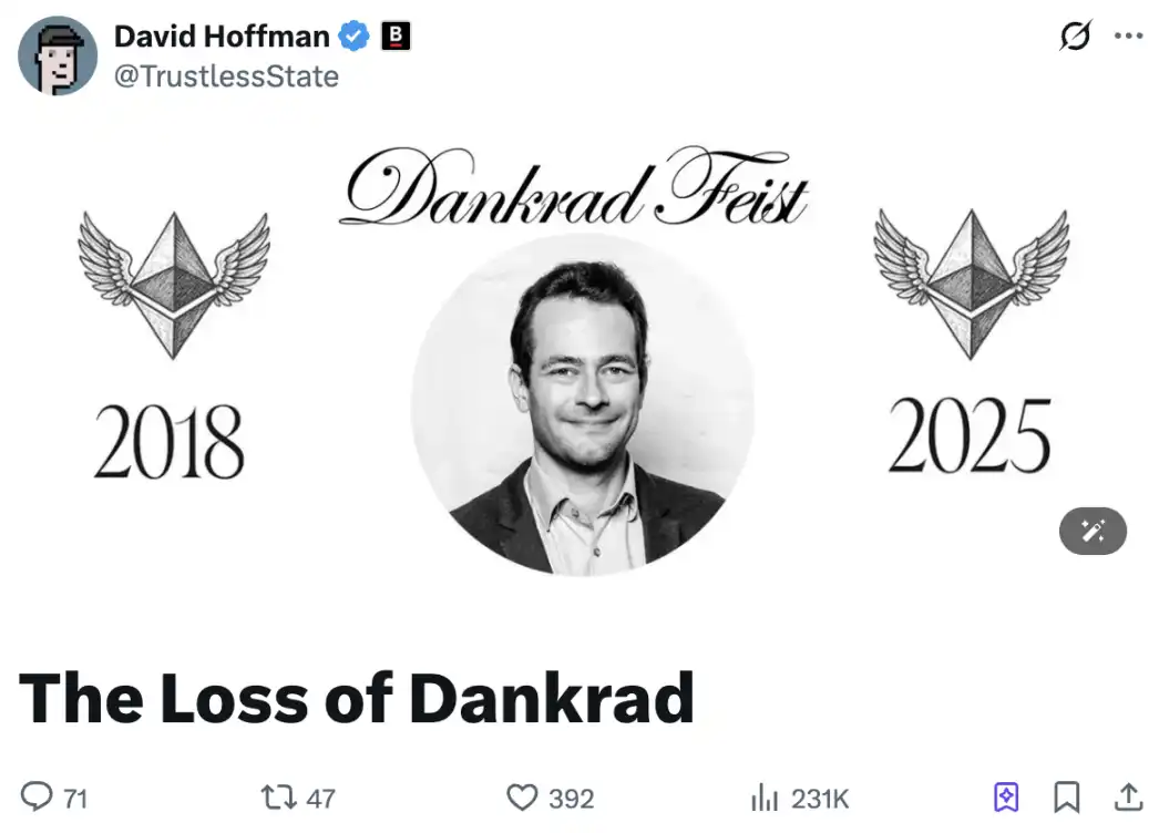 北京时间 19 日晚间,Bankless 联创 David Hoffman 在 X 上发文「悼念」在职时间最长的以太坊基金会研究员 Dankrad Feist 选择离开以太坊,加入稳定币 L1 Tempo。