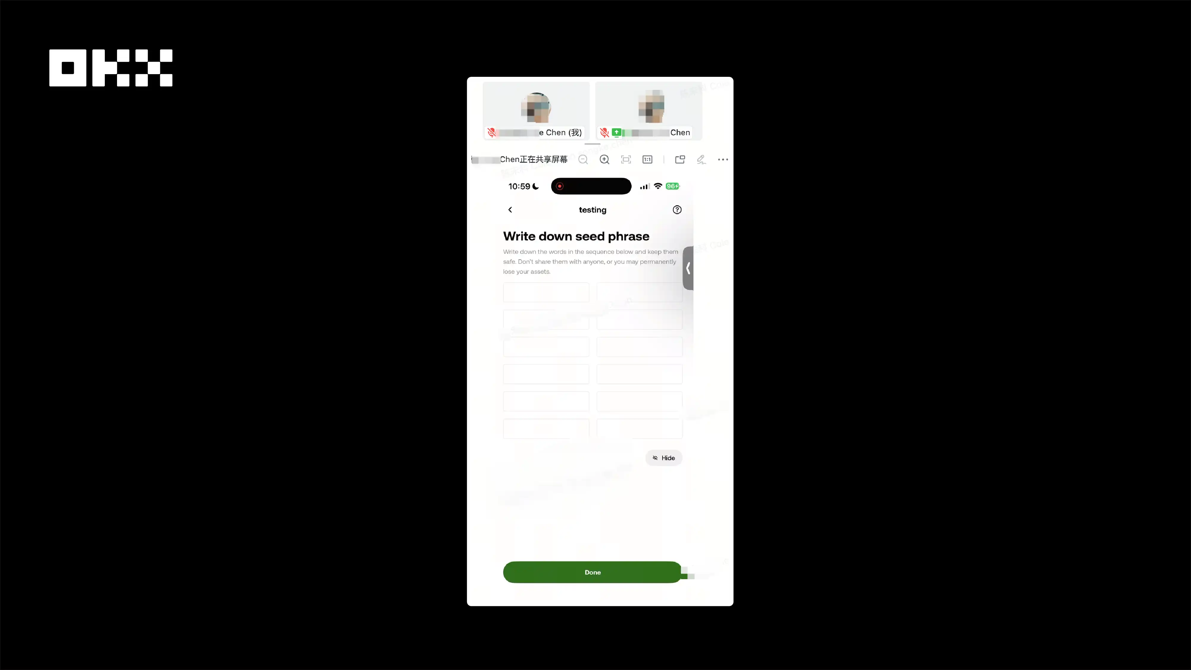 图片:检测到在投屏,OKX Wallet 会自动隐去助记词和私钥,他人无法看到文本