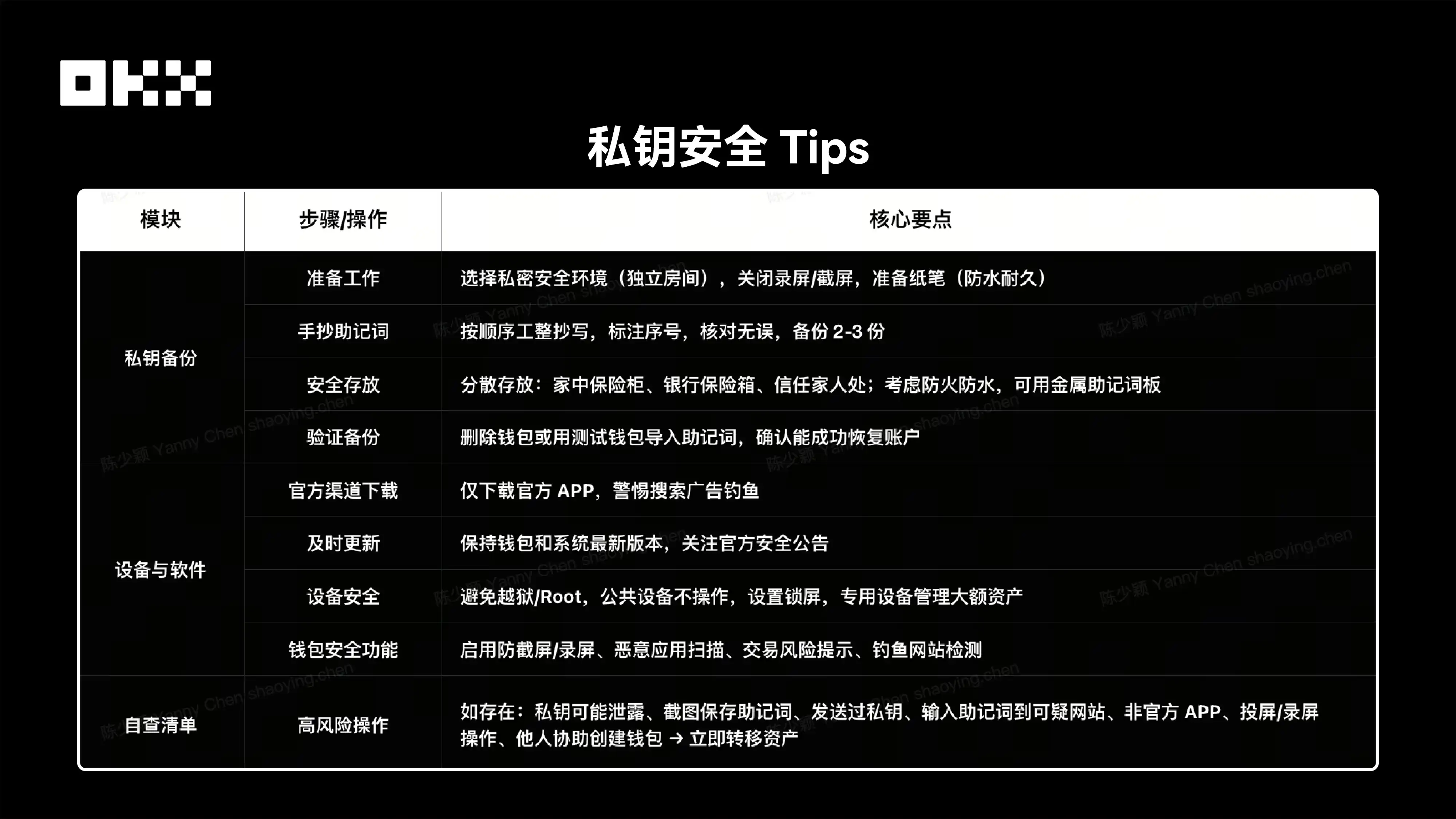 安全建议:很多用户出于「图方便」而养成的习惯,恰恰是最危险的。所以建议大家:1)不要截图助记词!建议用纸质手抄的方式保存,放在安全地方。2)下载 APP 一定认准官方渠道,不要轻易尝试来路不明的「增强版」或第三方改版。3)发现设备异常或曾截图保存私钥,不要抱侥幸心理,应立即将资产转移到新的钱包。4)OKX 做了什么?为了防止用户在私钥和助记词备份页面截图,我们在这些敏感页面禁用了截屏功能。