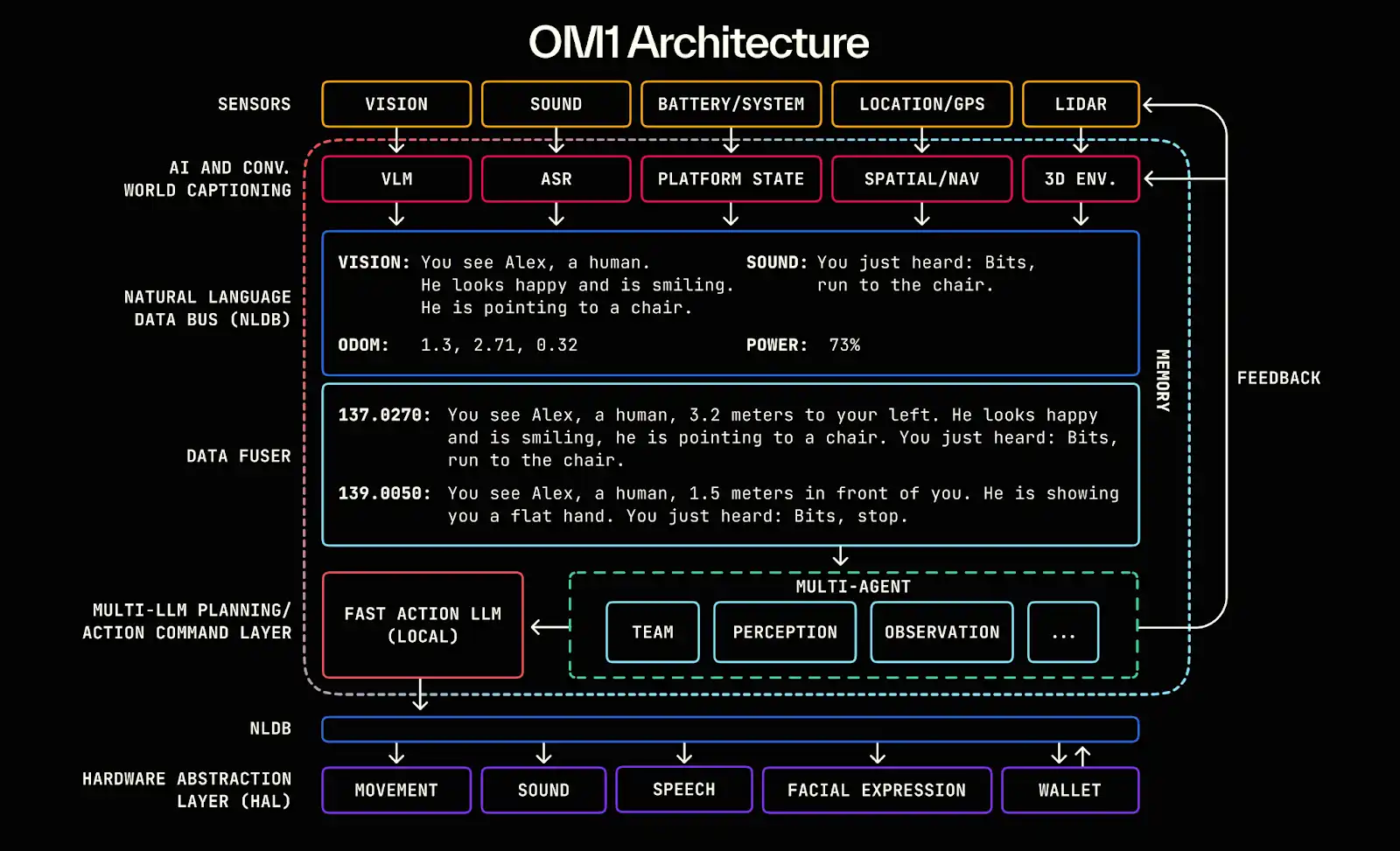 · OM1:构建在 ROS2 之上的模块化开源 AI 智能体运行时 (AI Runtime Layer),用于编排感知、规划与动作管线,服务于数字与实体机器人;