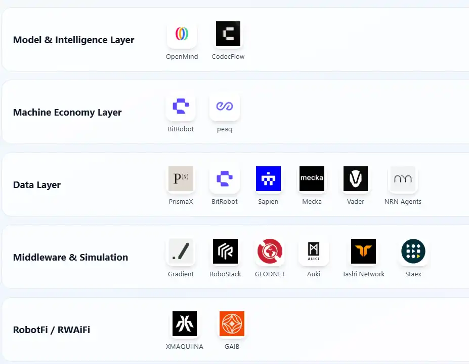 这一层聚焦于将机器人从「生产性工具」转化为「可金融化资产」的关键环节,通过 资产代币化、收益分配与去中心化治理,构建机器经济的金融基础设施。代表项目包括: