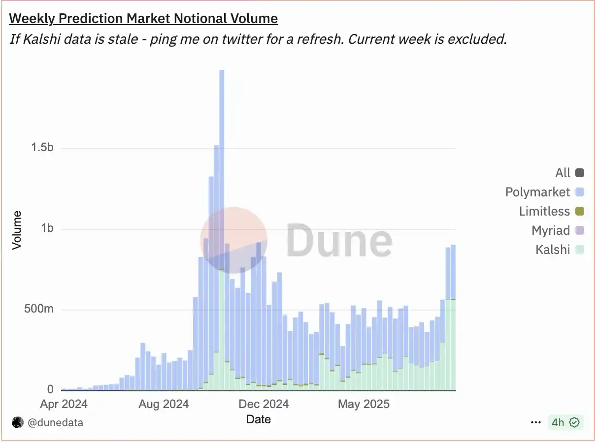 建立在预测市场之上的衍生品市场可能是该领域的下一阶段趋势。这类项目包括围绕事件结果的永续合约、期权或其他杠杆化金融工具。其核心理念很简单:在成熟金融体系中,衍生品交易量远超现货,预测市场在未来也有望呈现类似的增长路径。