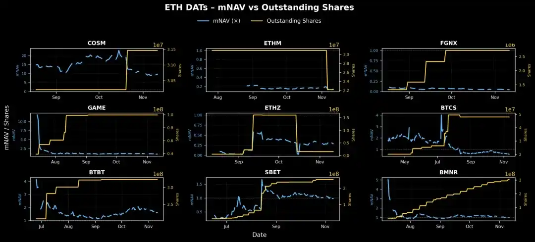 从上图可以看出,ETH DATs 在股权发行和市场情绪管理方面存在明显差异。大多数公司呈现流通股数量逐步增加趋势——表明可能进行 PIPE 或 ATM 发行。