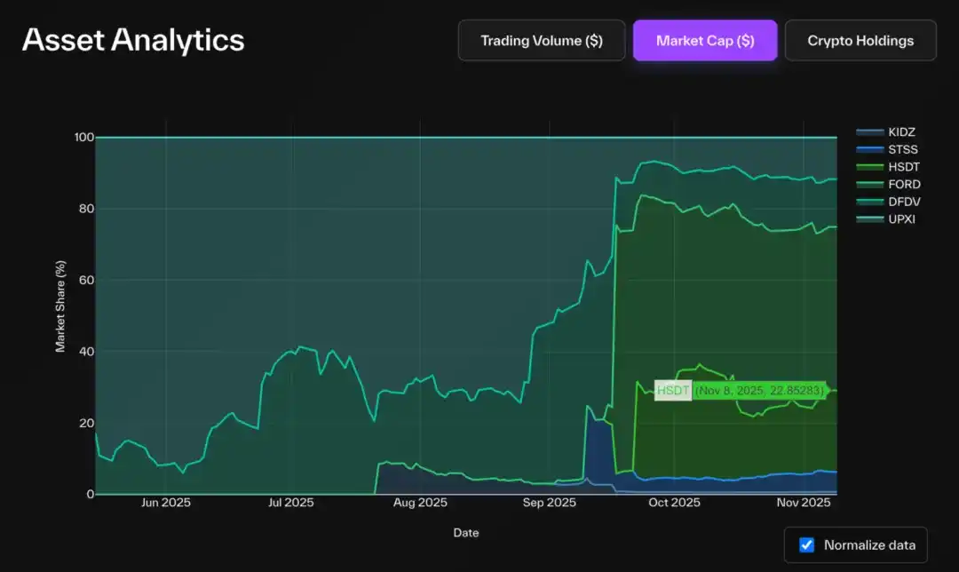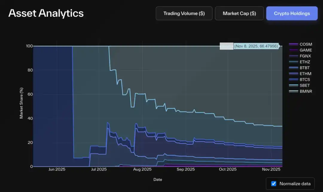 • 市场份额 ( 按 NAV、市值或交易量 ):衡量各数字资产不同 DAT 相对主导地位。由于各 DAT 股票代表不同资产底层价值,比较原始交易量可能产生误导,换手率 ( 交易量 / 市值 ) 更准确衡量流动性和活跃度。