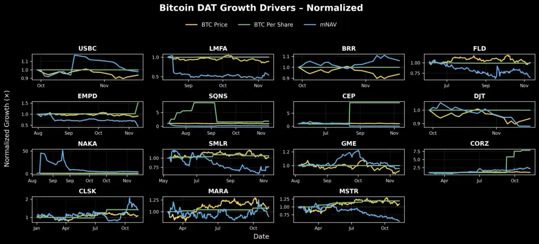 下图显示,几家 DAT 公司——HSDT、BMNR、BTBT、BTCS、CORZ 和 CEP——的基本面价值稳步提升,但由于市场环境变化,其股价未能充分体现。自成立以来,这些公司基本面指标显著增长,即便整体市场情绪有所萎缩。