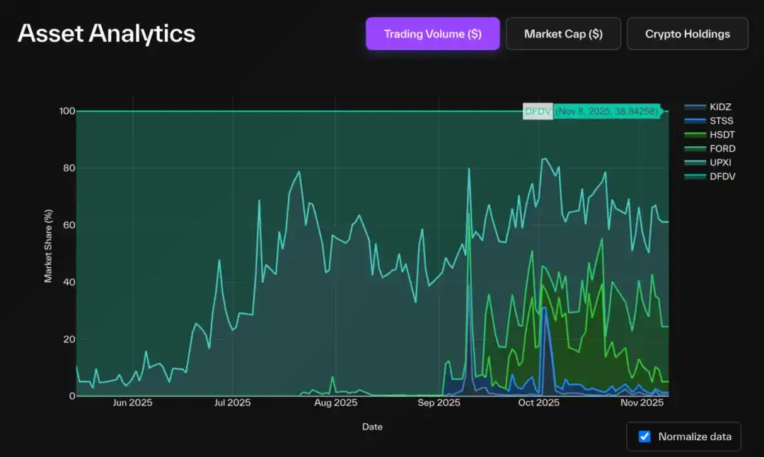 有趣的是,从交易量看,情况相反:DFDV 与 UPXI 活跃度领先 FORD。历史趋势表明二者是 Solana DAT 类别先行者,这一优势似乎延续至今,即使 FORD 后获更高 NAV,早期进入者保持的交易势头和市场关注度仍难以撼动。