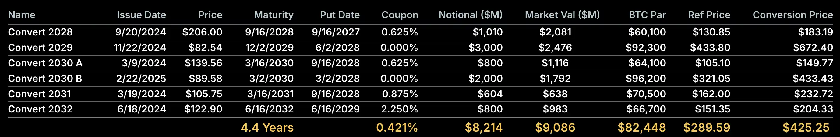 为补充资金,Strategy 开始寻求国际市场融资并推出新的融资工具永续优先股(需支付高额股息,8-10%),近期公司通过发行首只欧元计价永续优先股 STRE 募集资金约 7.1 亿美元,以支持其战略布局和比特币储备计划。值得一提的是,截至目前,公司有六笔未偿还的可转换债券,但到期日在 2027 年 9 月至 2032 年 6 月之间。