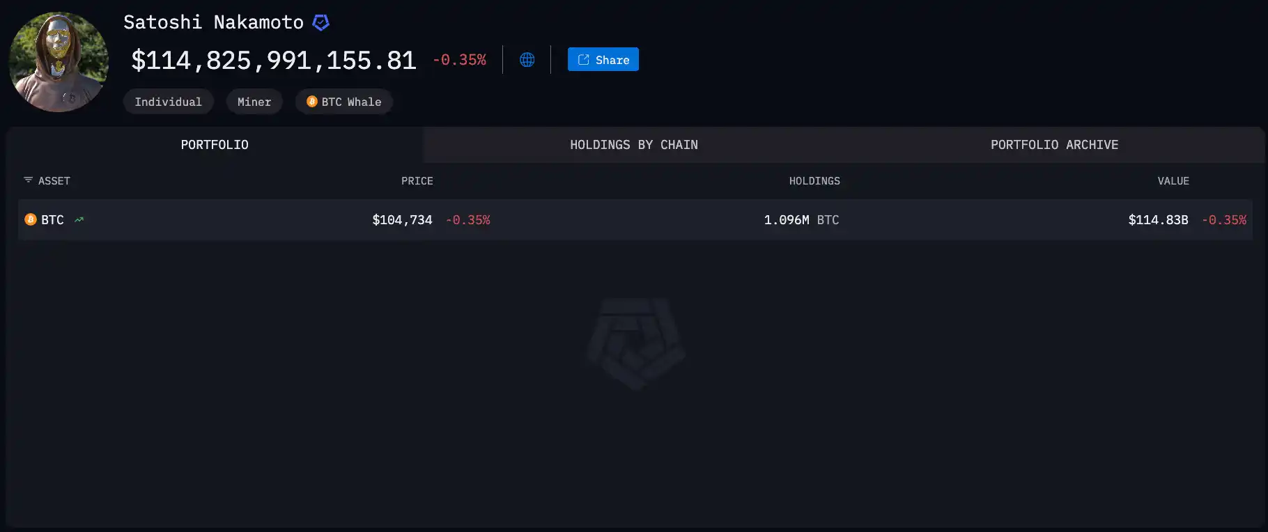 以下是根据 Arkham 数据整理出的全球最富有的链上个人名单,从中本聪的巨额财富开始,逐步列出从数十亿美元到数百万美元的持有者。