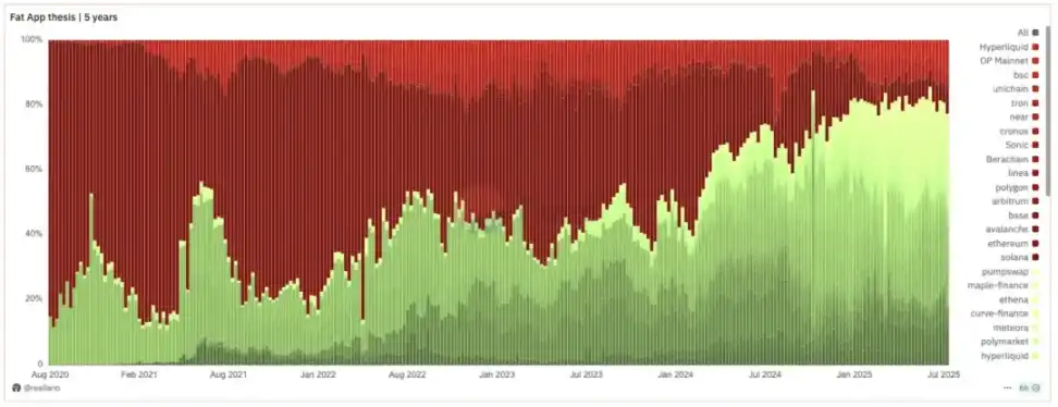 上图粗略对⽐了 2020 年⾄今协议(红⾊)和应⽤(绿⾊)的收⼊。我们可以看到应⽤捕获的价值在逐渐上升,并在今年达到约 80% 的⽔平。