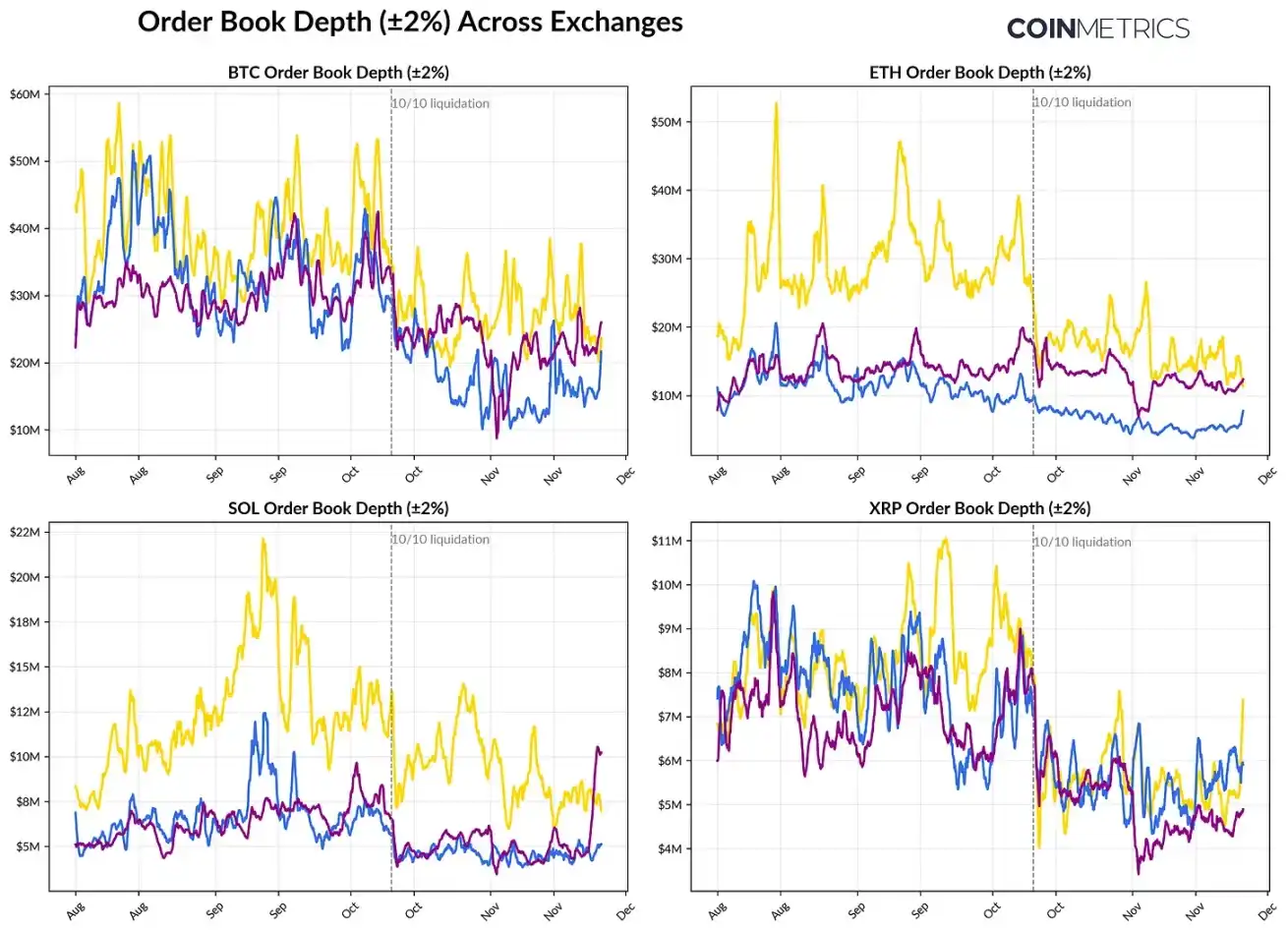 「10.11」清算潮后,现货市场流动性持续紧张。在主要交易平台,比特币、以太坊、Solana 等币种的成交量深度(±2%)仍较 10 月初水平低 30%-40%,表明流动性尚未随价格同步复苏。由于挂单量减少,市场仍处于脆弱状态,小额交易即可引发不成比例的价格波动,加剧波动性并放大强制抛售的影响。