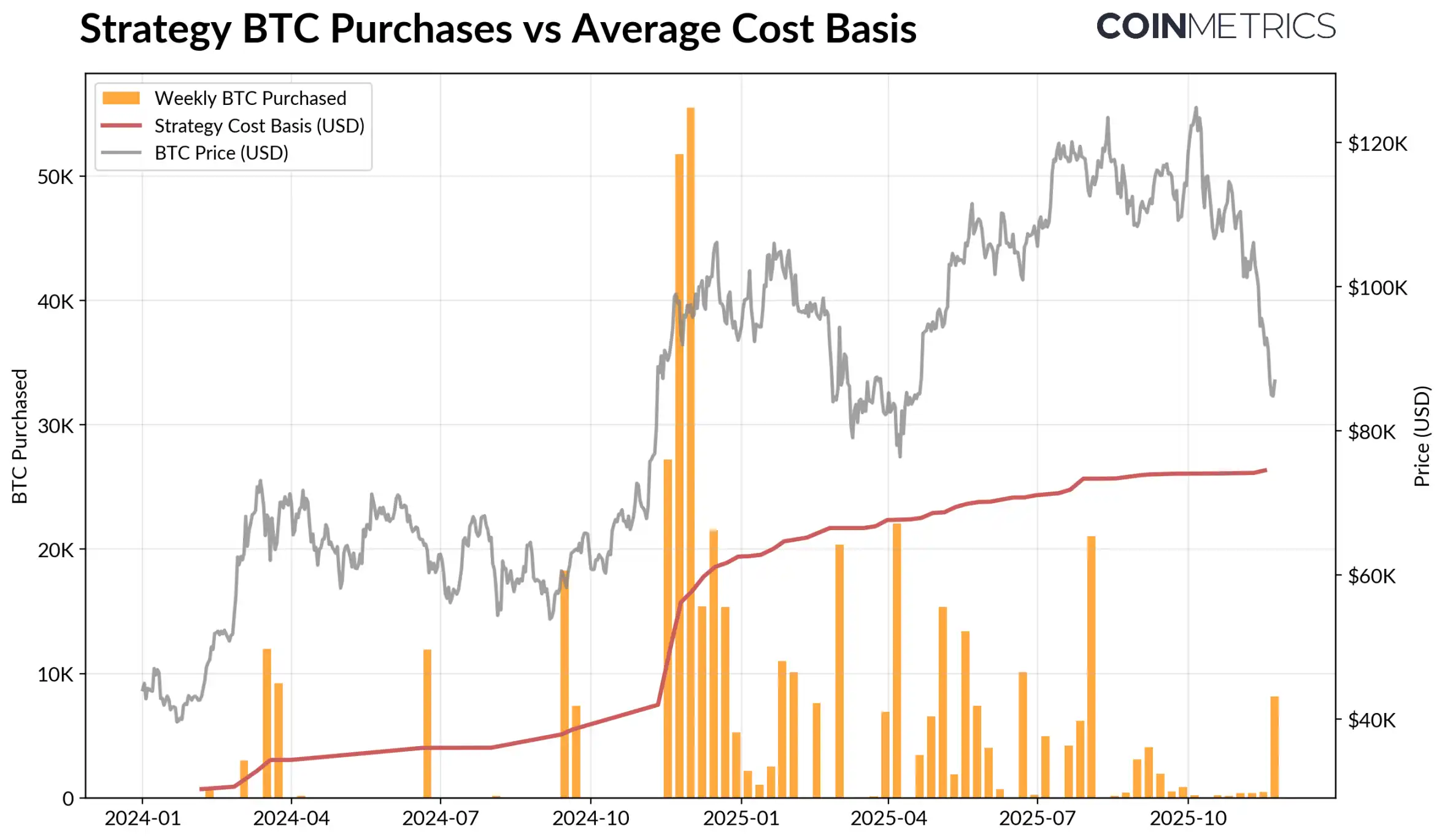 Strategy 的比特币购买量与平均成本基准,数据来源:Strategy 与 Bitbo Treasuries