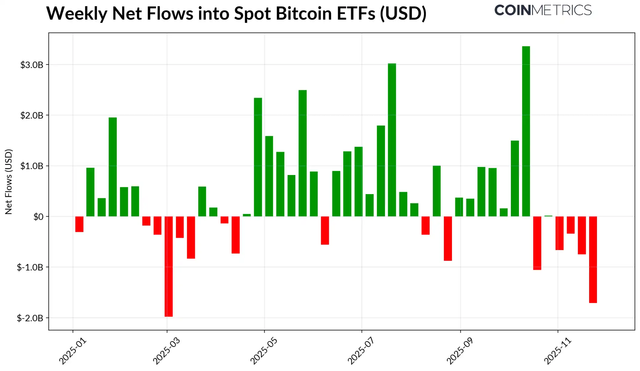 比特币 ETF 每周净流入,数据来源:Coin Metrics