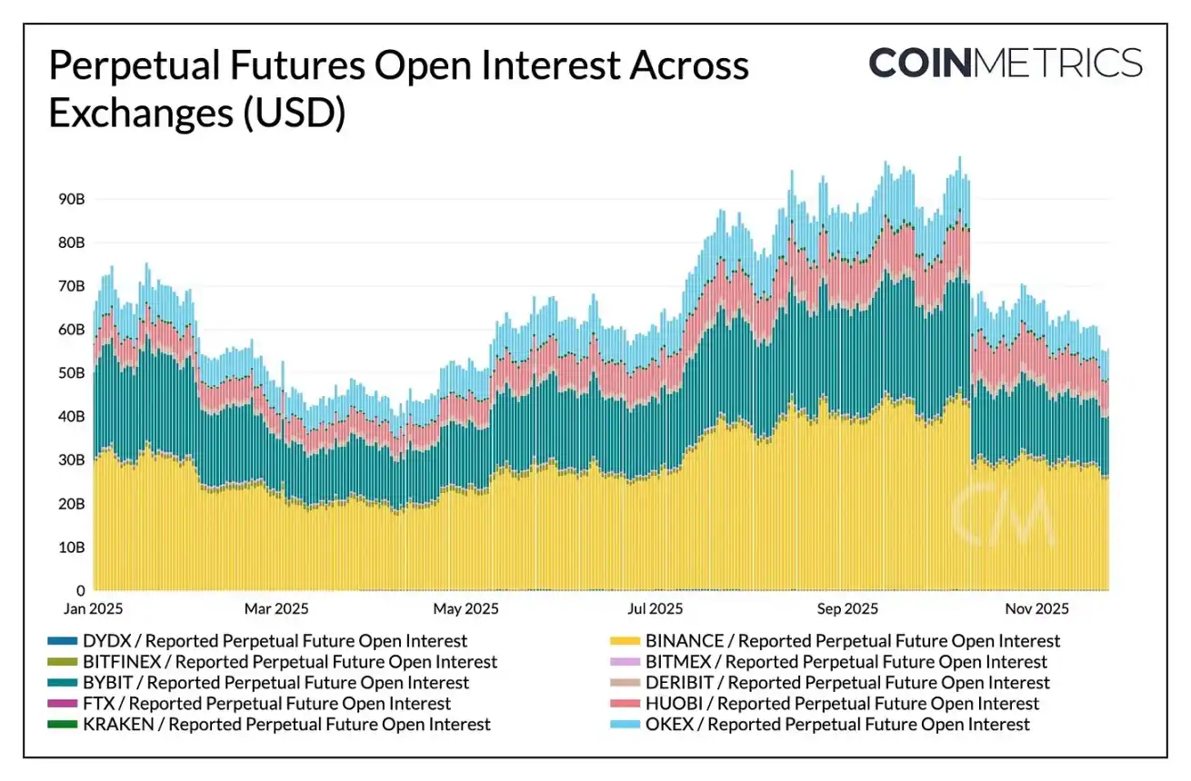 各交易平台永续合约持仓量变化,数据来源:Coin Metrics