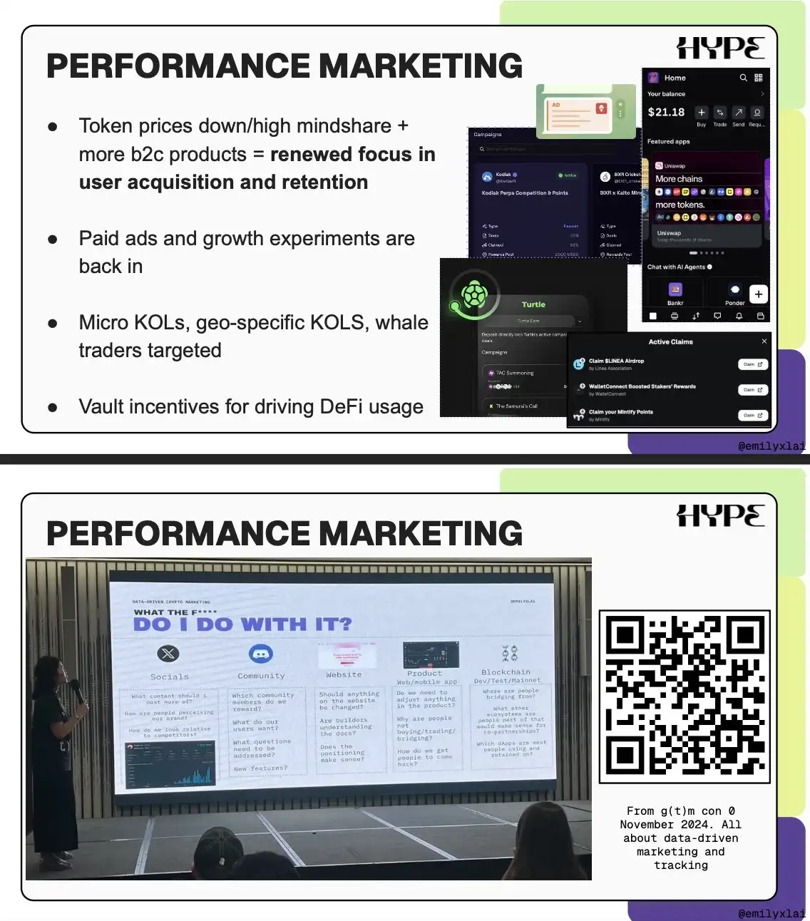 去年 11 月,第一届 g(t)m con 在曼谷举行。当时的主要趋势包括:团队主导的营销、创始人个人品牌、AI 代理、互动型「回复达人」、品牌吉祥物、空投、实习生账号,以及由 InfoFi 平台提出的神秘概念「心智占领」(品牌认知)。