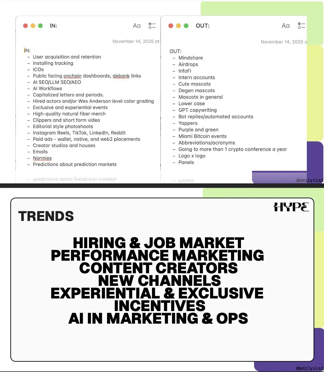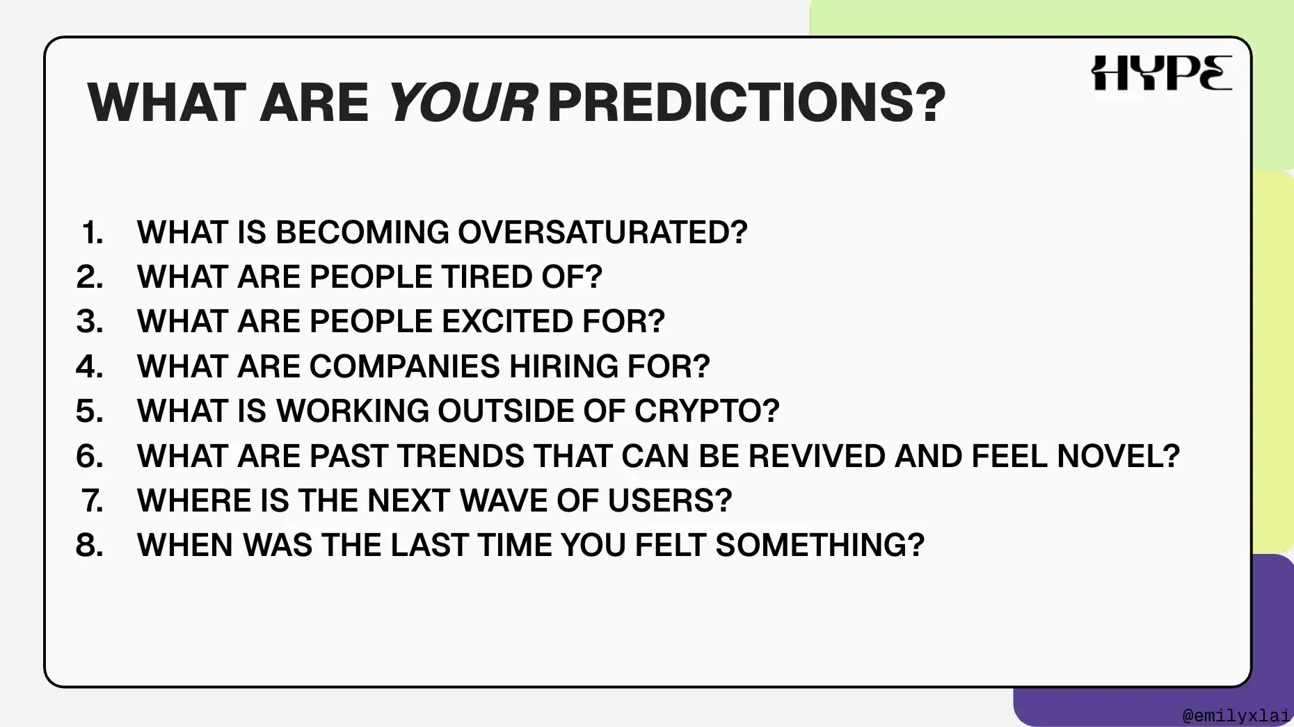 上述趋势和观察,直接影响了我们在 Hype 所做的一些业务和营销决策。在分享我的「保持领先」框架之前,我收集了 Hype 团队对加密营销的预测。你可以阅读来自 @0xdannyhype、@ChrisRuzArc、@groverGPT、@izaakonx、@Timmbo_Slice 等人的观点: