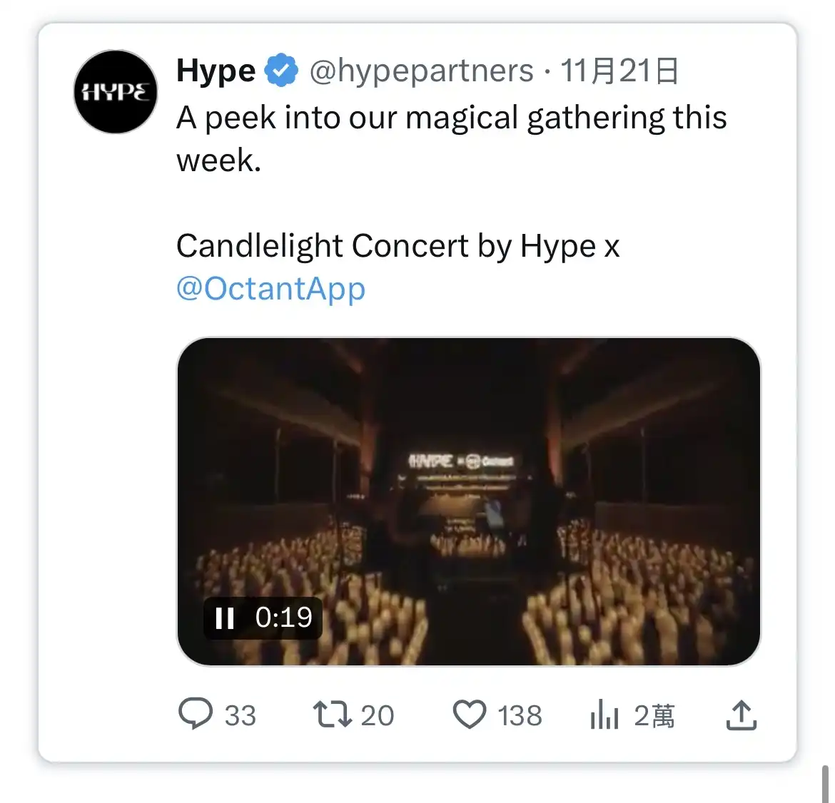 上周,我们与 @octantapp 举办了烛光音乐会,你可以在这里看到现场片段。活动仅限邀请,因为场地无法容纳全部 2 万人。如果你想参加下一场体验,请联系 @cryptokwueen 或我。