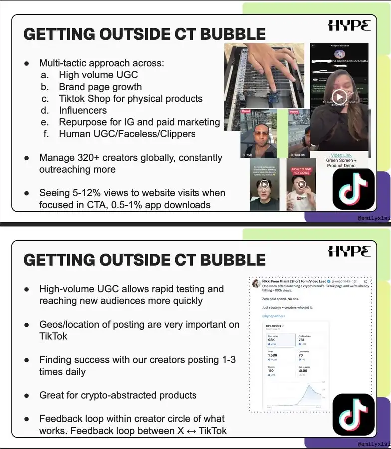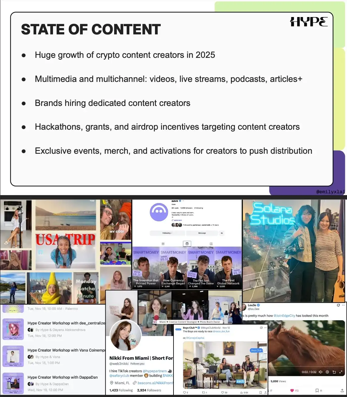 在 Hype (@hypepartners),我们在 DevConnect 周举办了 4 场内容创作者工作坊,并在今年 1 月引入 @web3nikki 领导新的短视频部门。内容将继续饱和,质量、深度和制作水平会变得更重要,同时走出 CT、触达新用户也同样关键。
