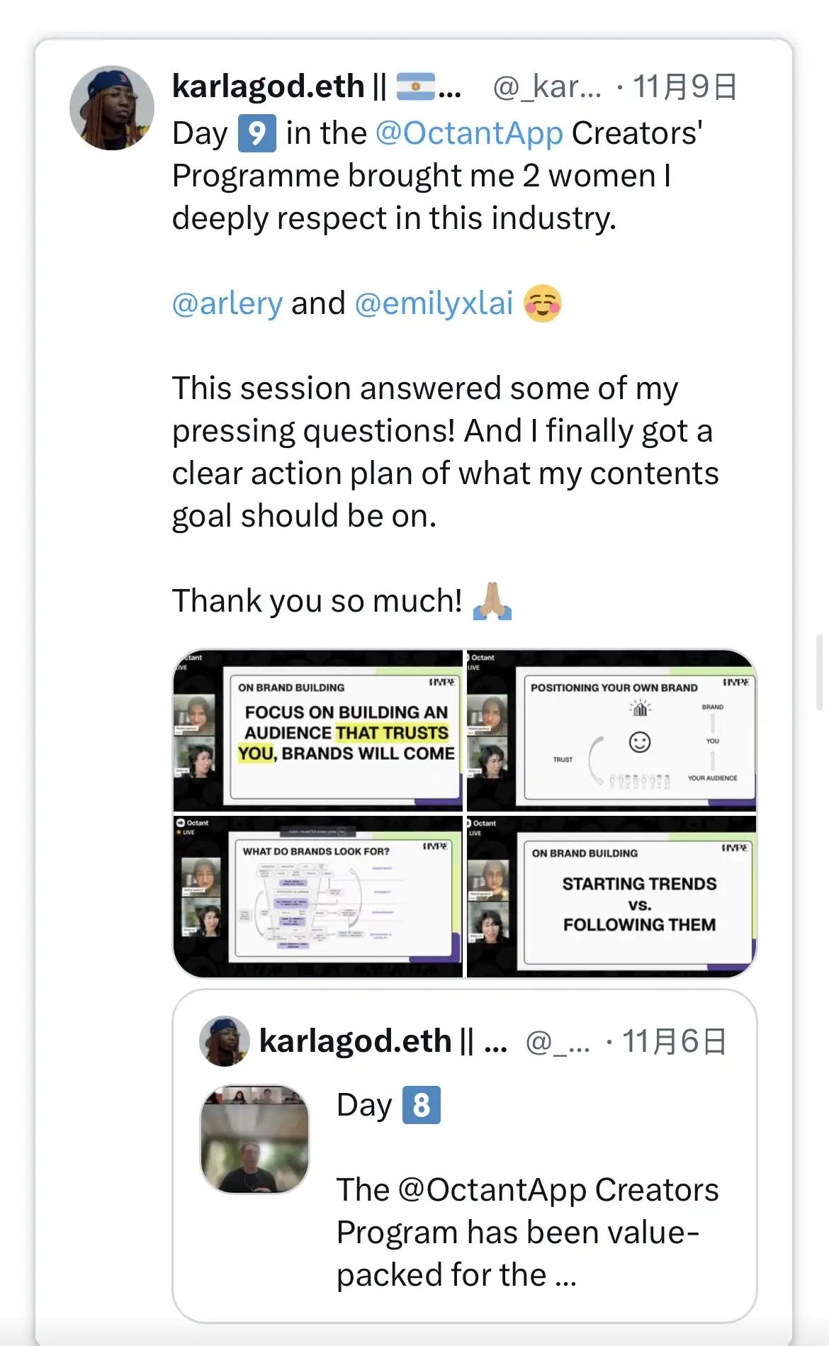 内容形式也在多样化:除了文字和视频,还有直播系列(如 @boysclubworld)、静态系列、播客、短视频片段、3D 或 AI 公告视频等。@OctantApp 为创作者提供资助,我最近也举办了一场工作坊,讲解品牌在内容创作中看重的心理因素。