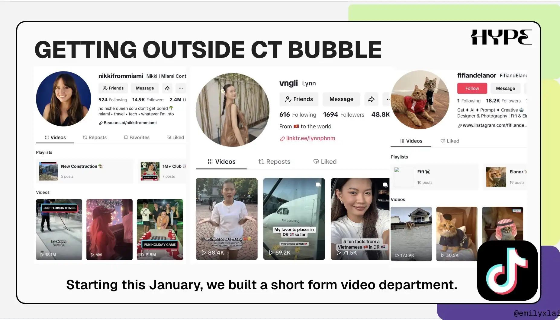 今年 1 月,我们注意到品牌对 Instagram、YouTube 和 TikTok 等渠道的需求明显增加,因此引入 @web3nikki,成立了专注于品牌增长和用户获取的 短视频部门,重点布局 TikTok。团队成员全部是 TikTok 原生用户,熟悉算法、懂得如何打造爆款,并能将内容策略调整为加密视角。