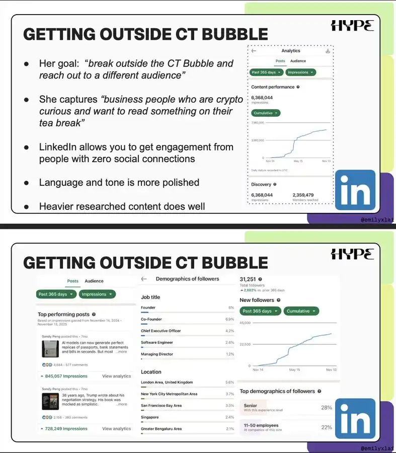 以 @Scroll_ZKP 联合创始人 @sandypeng 为例:对于不常用 LinkedIn 的人来说,她在 2025 年持续发帖,从零增长到 630 万曝光量和 3.1 万粉丝,并分享了她的策略和数据(首次公开,感谢 Sandy)。