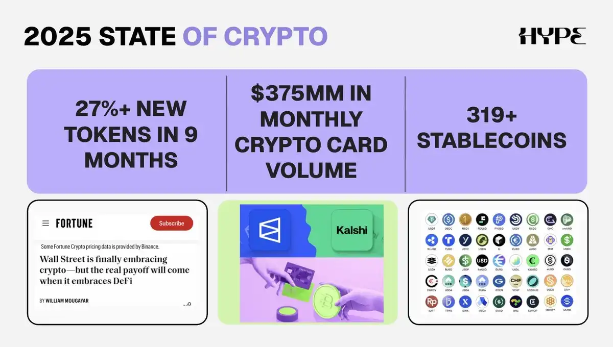 自从我在 2025 年 2 月的 EthDenver 大会上做主题演讲以来,我们见证了:新增稳定币超过 319 种;机构与华尔街入场,形式包括企业区块链、DAT、ETF,以及金融科技巨头采用稳定币;监管环境放松,推出 GENIUS 法案,美国迎来「加密友好型」总统;新代币发行量增长超 27%,截至撰写时已达 5.67 亿枚;加密支付卡选项激增,仅 2025 年 10 月,在可追踪区块链上的卡交易量就达到 3.75 亿美元;预测市场爆发,@Kalshi 和 @Polymarket 创下新交易量纪录,且有新玩家入场;基于加密轨道的新型银行和移动优先金融应用上线