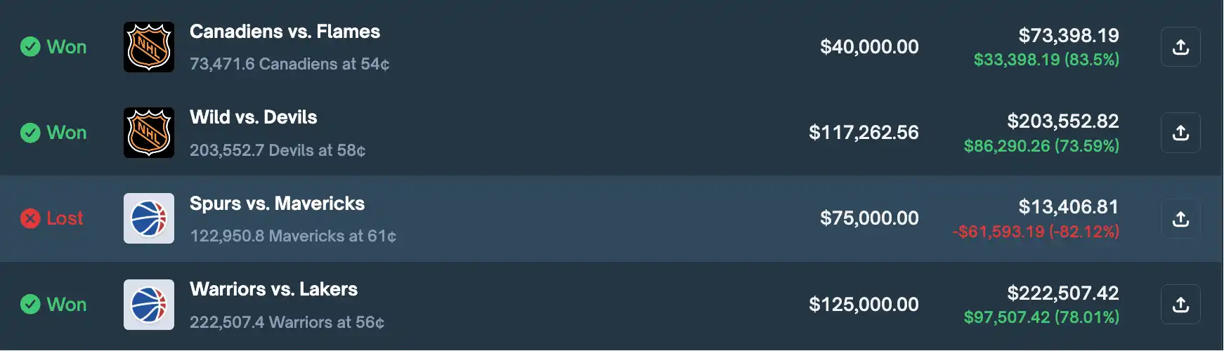 · 最大的一笔盈利来自 NHL 比赛中 Bruins 对阵 Senators,投入 99.2 万美元,盈利超 60.7 万美元。
