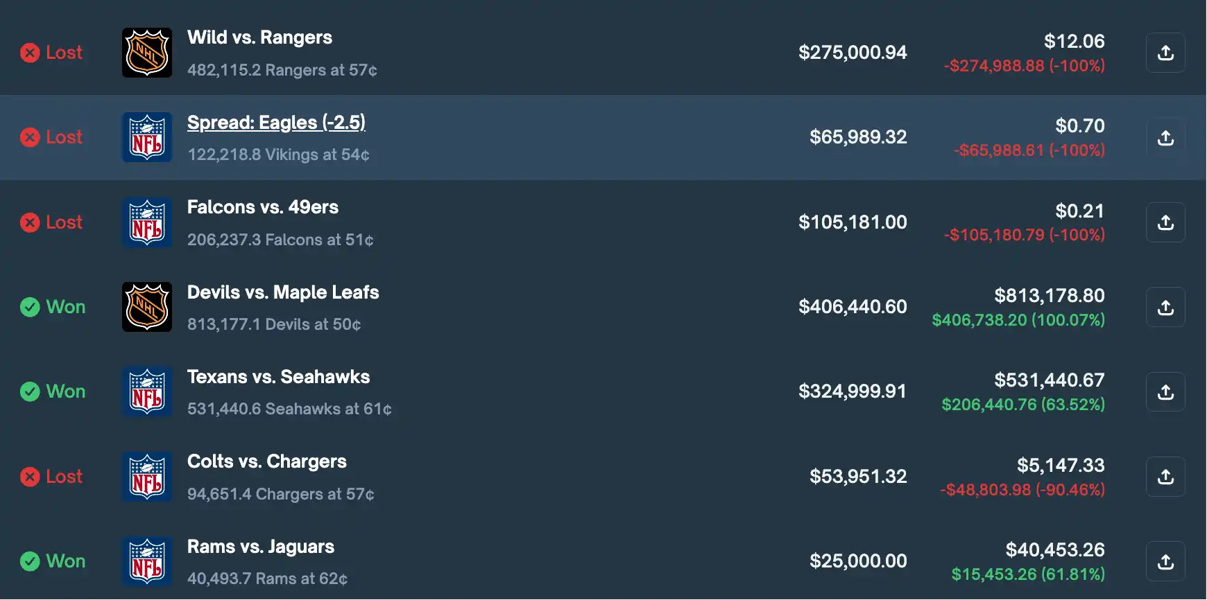 这里也能够看出 Mayuravarma 的押注风格:其更倾向于盘前押注,下注金额从数千美元到数十万美元不等,且极少在盘中卖出。这既成为了其能够在早期凭借小资金一步步滚仓赚到大结果的原因,也为后续上头 ALL IN、一把梭哈 NHL 比赛妄图翻盘终遭反噬埋下了伏笔。