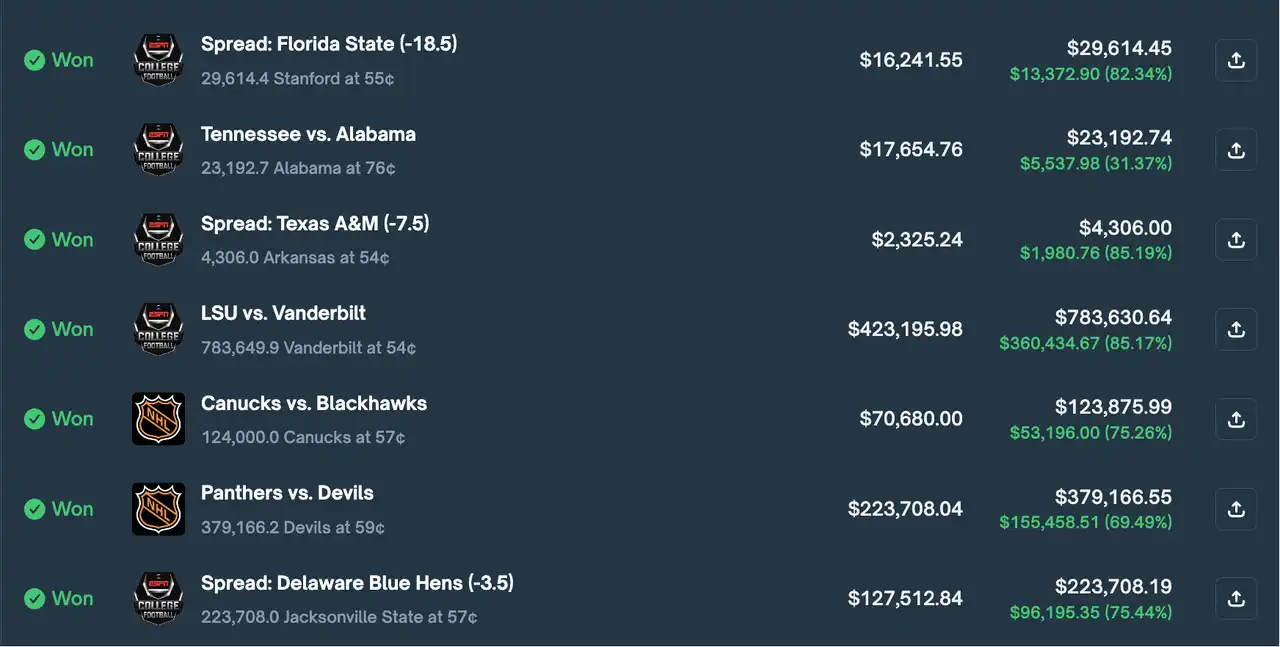 初时,Mayuravarma 押注几乎称得上「逢赌必赢」:在 5 场 CFB 赛事及 2 场 NHL 比赛中,其凭借多次下注,获得了 30%~82% 左右的回报率,最多一次盈利高达 36 万美元。